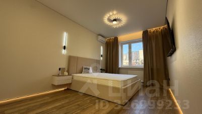 В комнате удобная кровать с дизайнерскими парящими полочками с выдвижными ящиками.Телевизор Xiaomi с диагональю 55".Есть большая ниша-гардеробная с зеркальными дверьми в потолок