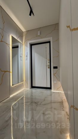 В коридоре большое зеркало с подсветкой и вместительный парящий шкаф с подсветкой