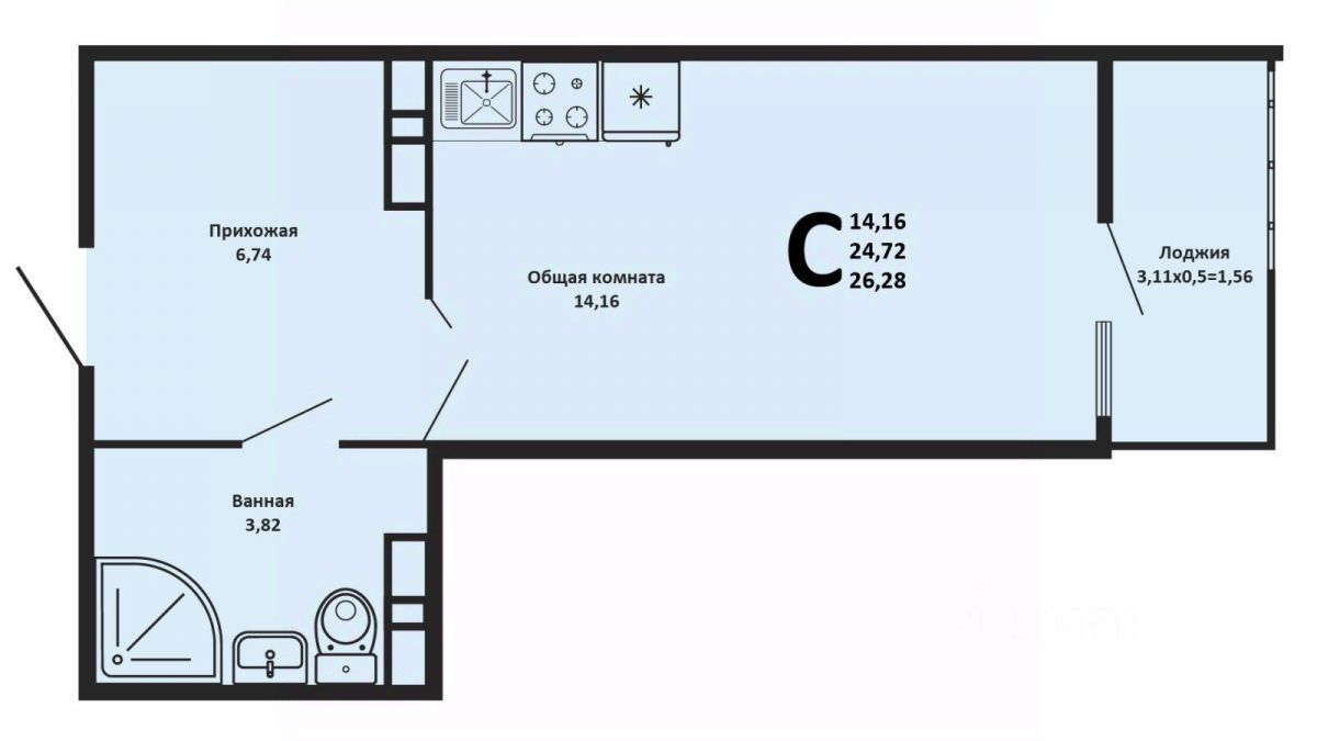 Площадь: 26,28 м², 15 этаж из 20 в современном кирпичном доме.