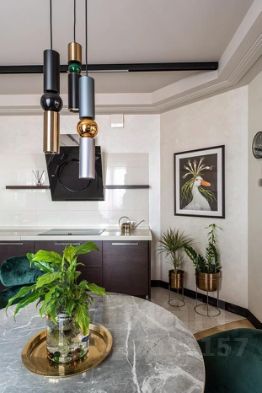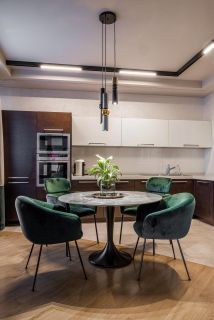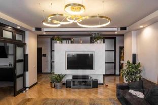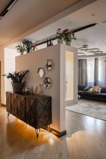 Выполнен из экологически чистых материалов премиум-класса: дубовый паркет, итальянская декоративная штукатурка, итальянский керамогранит в санузлах, потолки окрашены дизайнерской краской, межкомнатные двери из массива. Приятная лаконичная цветовая гамма.