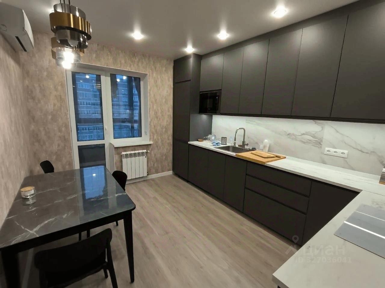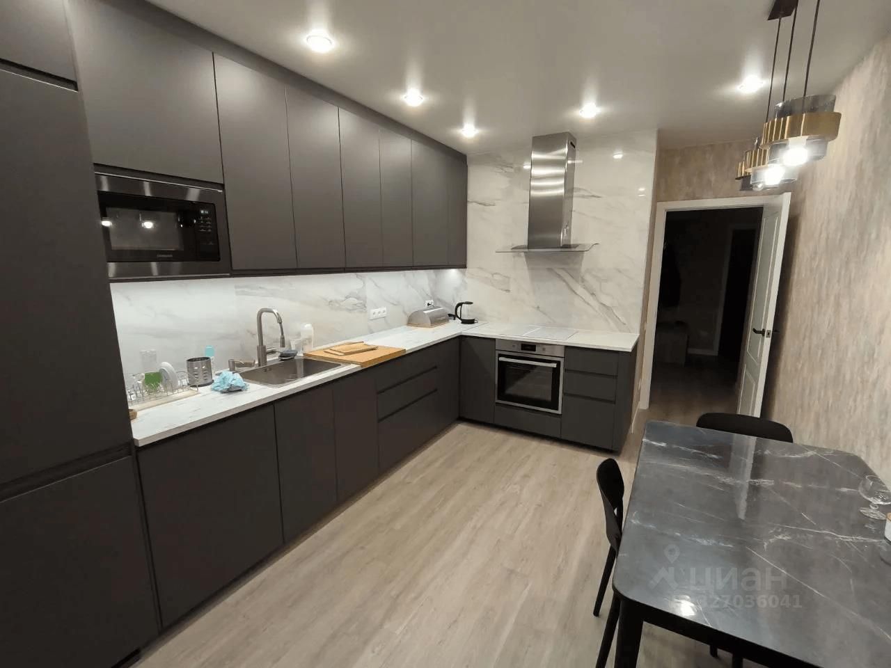 В самой квартире выполнен качественный ремонт из дорогих материалов. Большая кухня-гостиная, места хранения, тёплый пол. Всё делалось для себя, для жизни.
