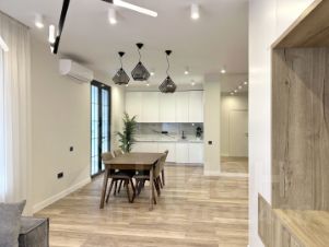 В квартире выполнен стильный дизайнерский ремонт с использованием высококачественных отделочных материалов. Мебель изготовлена по индивидуальному проекту, а техника представлена премиальными брендами.