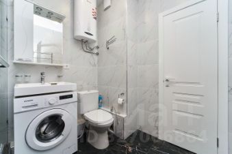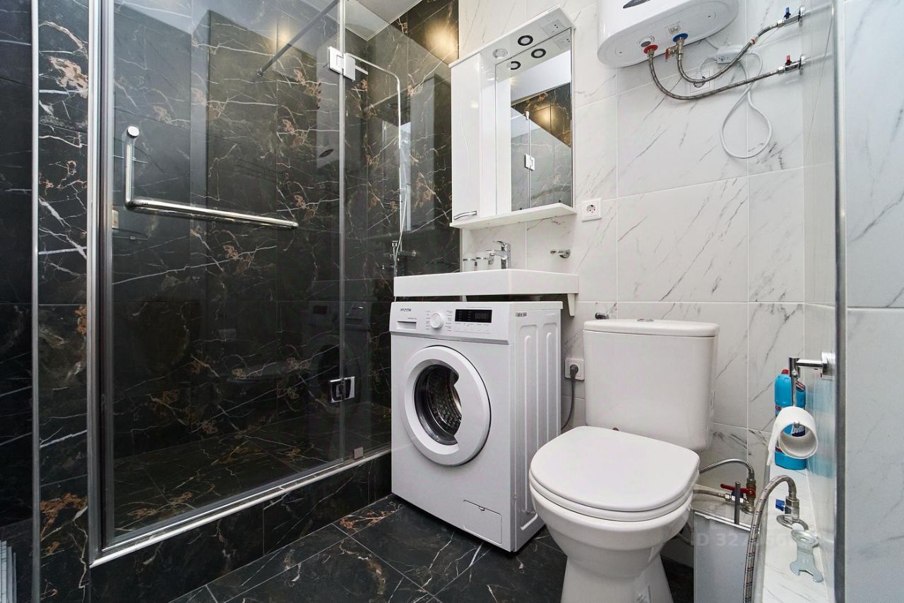 Ванная комната отделана дизайнерской керамической плиткой, установлена качественная сантехника, большая удобная душевая кабина.