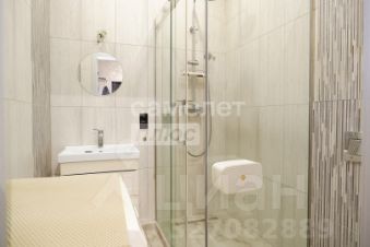 совмещенный санузел со стильной стеклянной душевой кабиной.