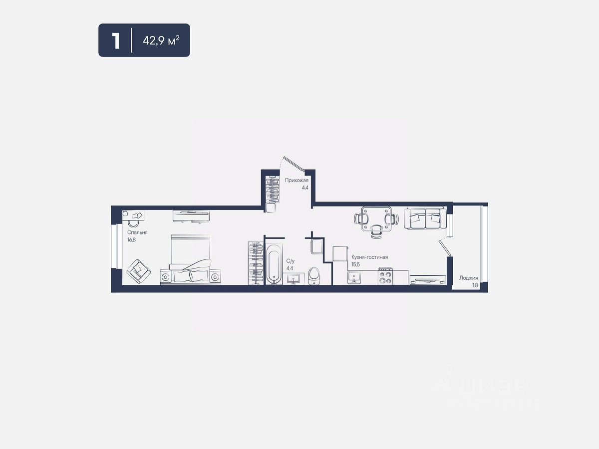 Общая площадь42,9 м²