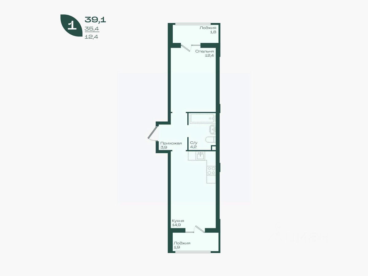 Общая площадь39,1 м²