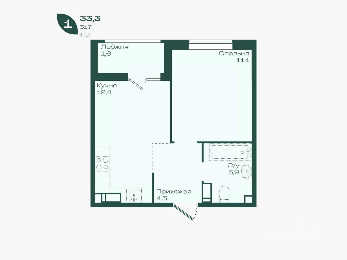 Общая площадь33,3 м²