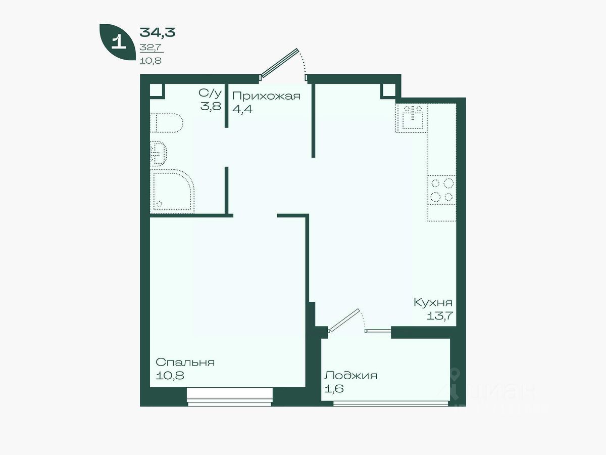 Общая площадь34,3 м²