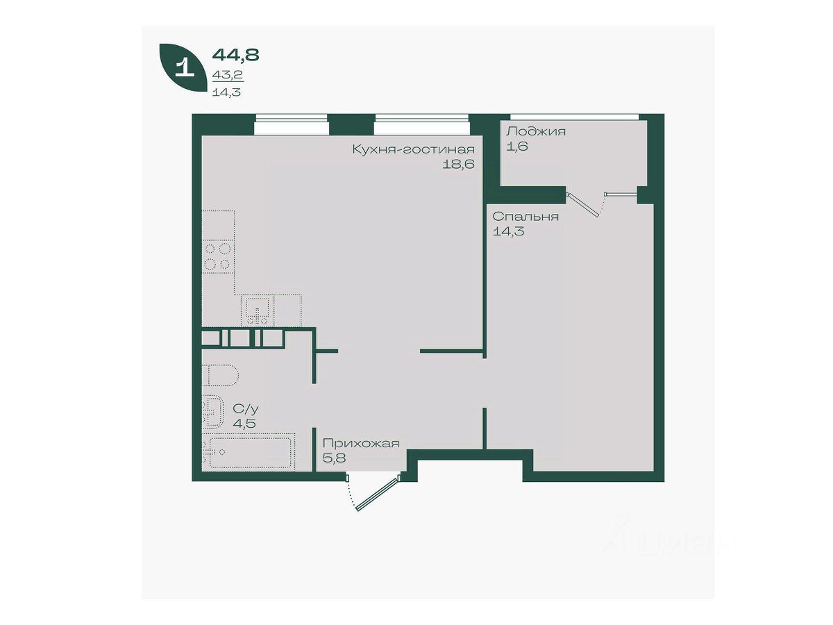 Общая площадь44,8 м²