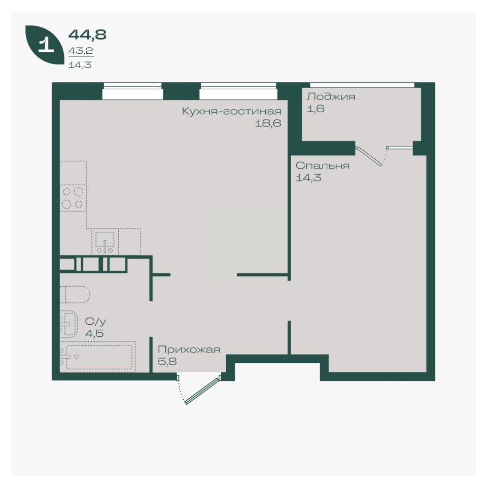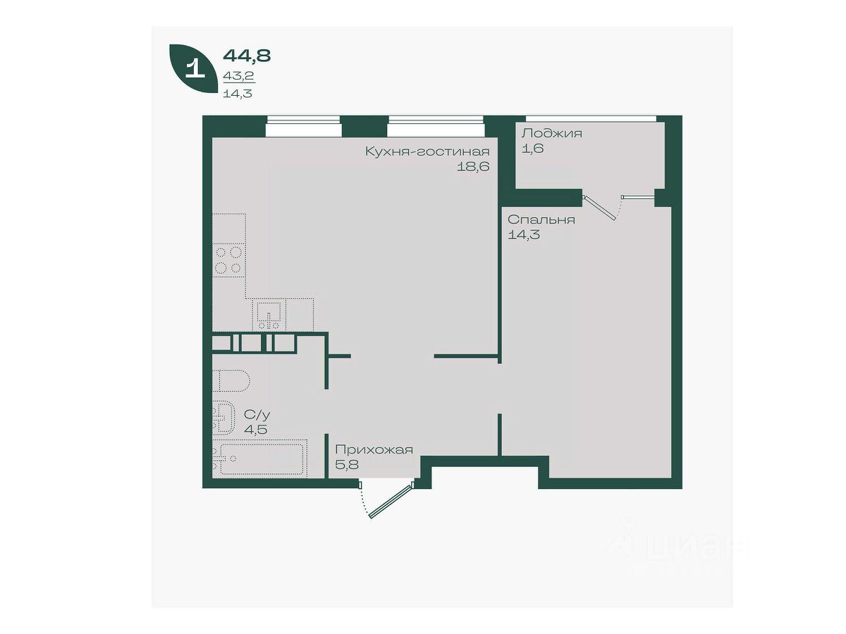 Общая площадь44,8 м²