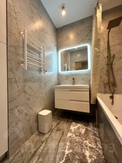 Выполнен качественный ремонт с использованием качественных материалов: ламинат в жилых комнатах и прихожей, керамическая плитка в санузле, натяжные потолки с точечными светильниками и современная сантехника.