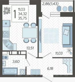 Однокомнатная квартира 35 кв.м. в ЖК Смородина