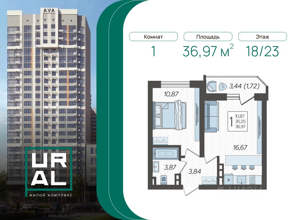 В новом жилом комплексе комфорт-класса продается 1-комнатная квартира площадью 36.97 кв. м, расположенная на 18 этаже. 23-этажный жилой комплекс URAL от девелопера AVA находится на улице Уральской, в районе с развитой инфраструктурой.