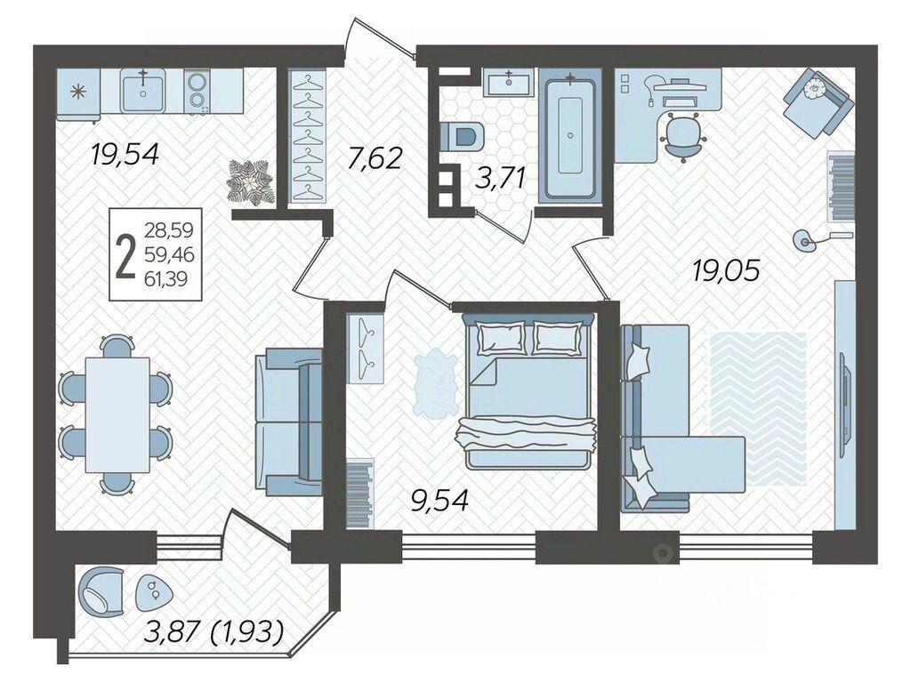 Продаётся 2-комнатная квартира в строящемся доме (Дом Литер 1), срок сдачи: 1 кв. 2025, общей площадью 61.39 кв.м., на 22 этаже. Без отделки, но с возможностью заказать отделку