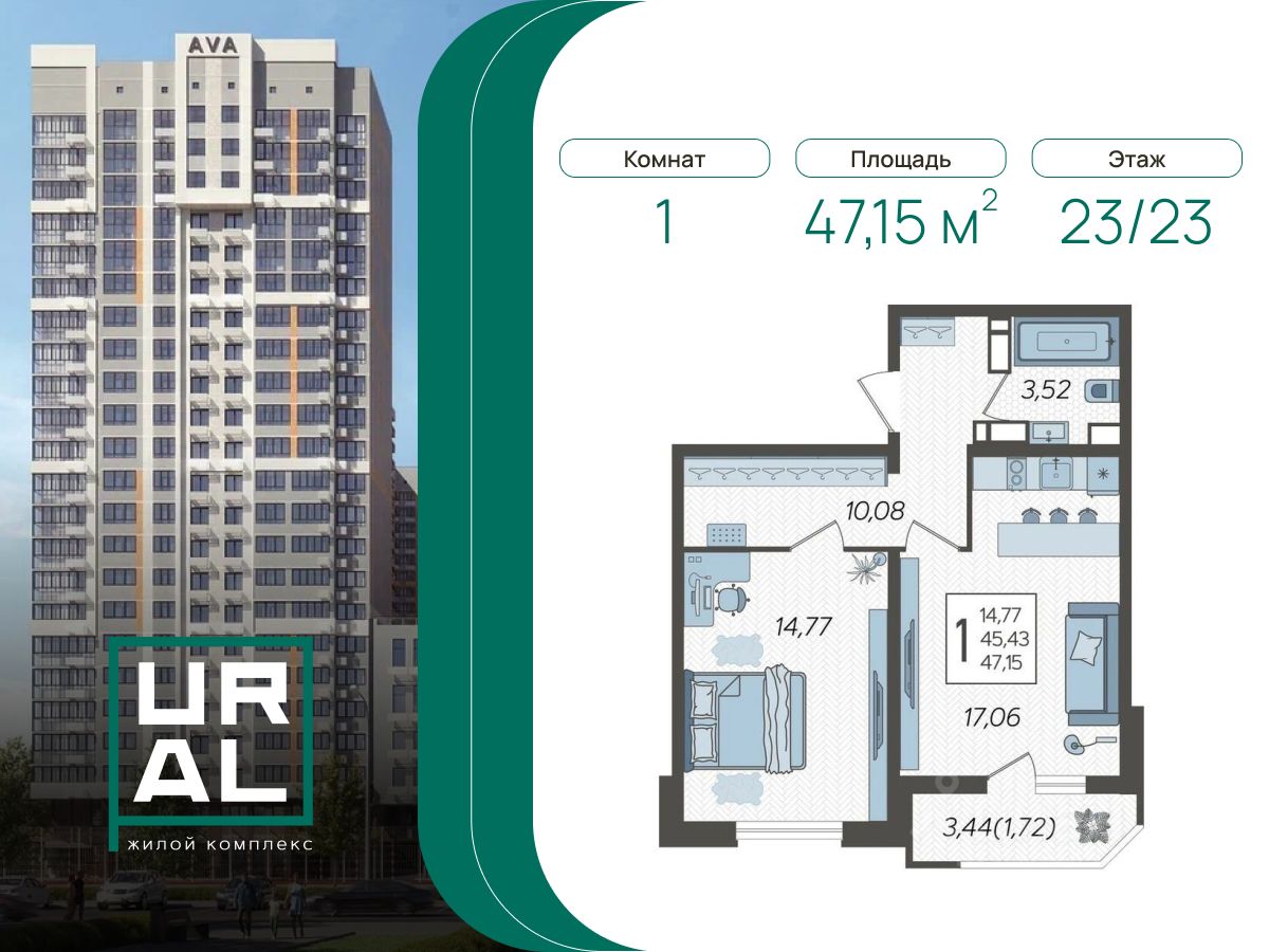 В новом жилом комплексе комфорт-класса продается 1-комнатная квартира площадью 47.15 кв. м, расположенная на 23 этаже. 23-этажный жилой комплекс URAL от девелопера AVA находится на улице Уральской, в районе с развитой инфраструктурой.