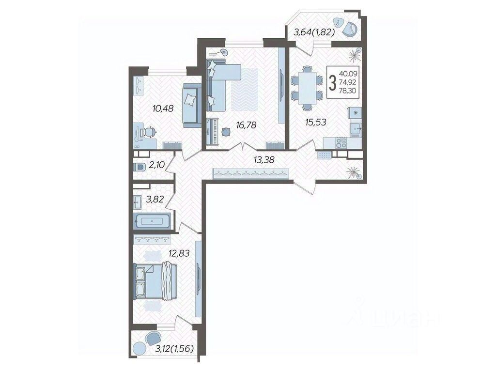 Продаётся 3-комнатная квартира в строящемся доме (Дом Литер 1), срок сдачи: 1 кв. 2025, общей площадью 78.3 кв.м., на 9 этаже. Без отделки, но с возможностью заказать отделку