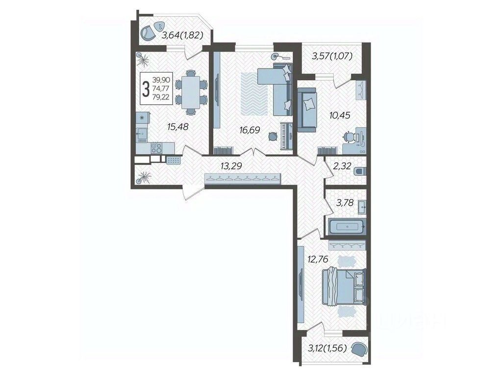 Продаётся 3-комнатная квартира в строящемся доме (Дом Литер 1), срок сдачи: 1 кв. 2025, общей площадью 79.22 кв.м., на 3 этаже. Без отделки, но с возможностью заказать отделку