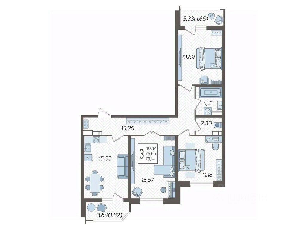 Продаётся 3-комнатная квартира в строящемся доме (Дом Литер 1), срок сдачи: 1 кв. 2025, общей площадью 79.14 кв.м., на 9 этаже. Без отделки, но с возможностью заказать отделку