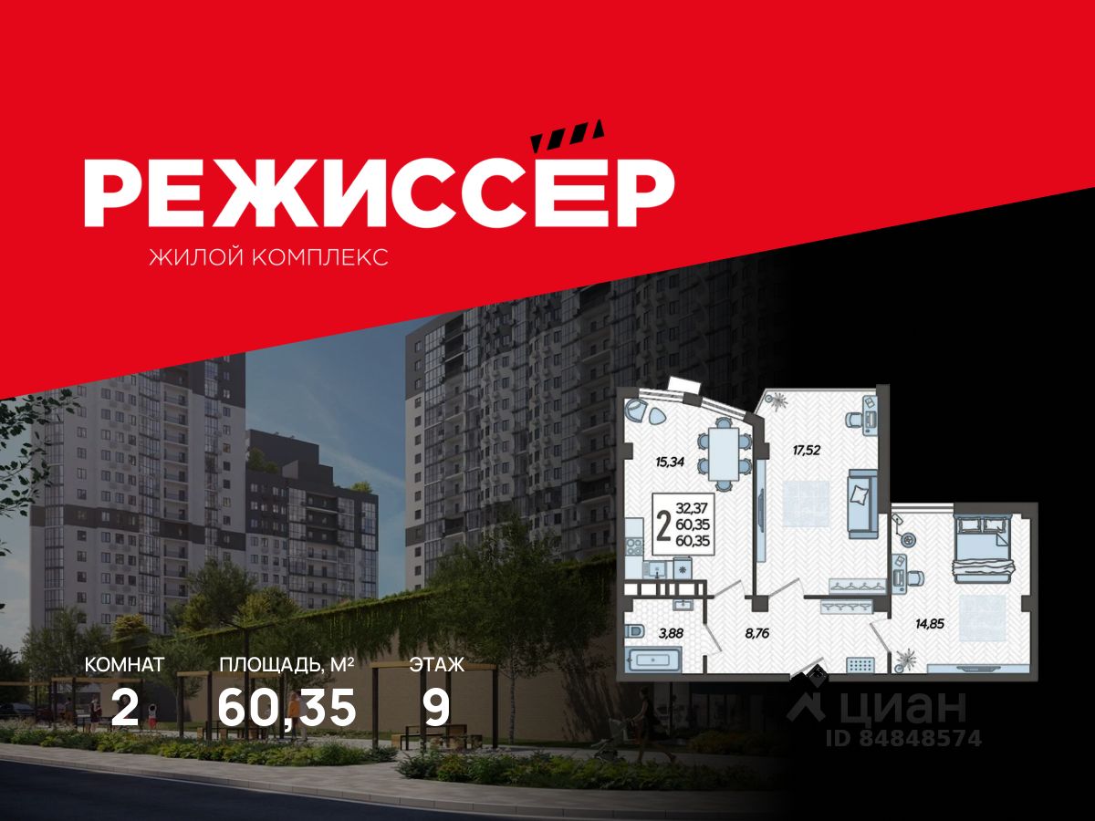 Продаются 2-комнатные апартаменты в ЖК "Режиссёр" в доме (Литер 4), срок сдачи: 2 кв. 2026, общей площадью 60.35 кв.м., на 9 этаже. Без отделки, но с возможностью заказать ремонт.