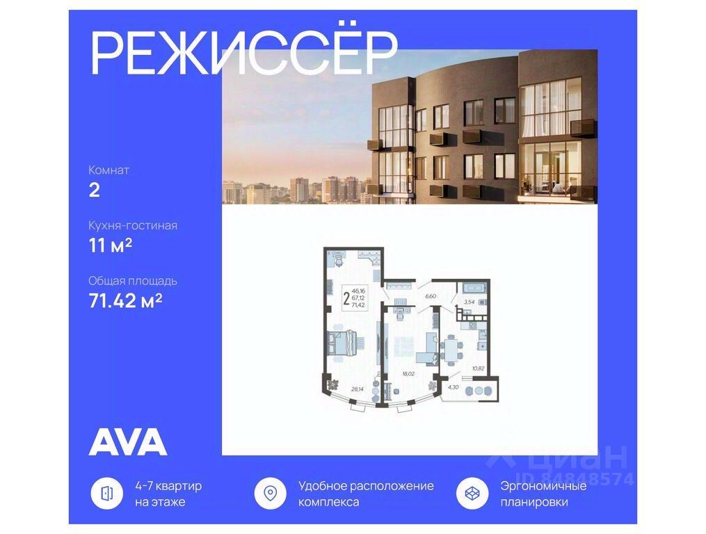 Продаются 2-комнатные апартаменты в ЖК "Режиссёр" в доме (Литер 4), срок сдачи: 2 кв. 2026, общей площадью 71.42 кв.м., на 3 этаже. Без отделки, но с возможностью заказать ремонт.