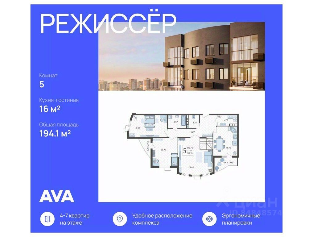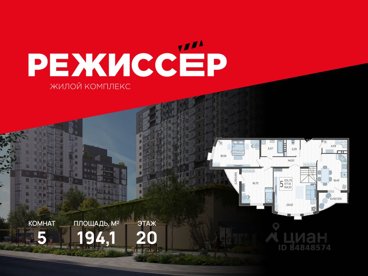 Продается 5-комнатная квартира в ЖК "Режиссёр" в доме (Литер 4), срок сдачи: 2 кв. 2026, общей площадью 194.1 кв.м., на 20 этаже. Без отделки, но с возможностью заказать ремонт.