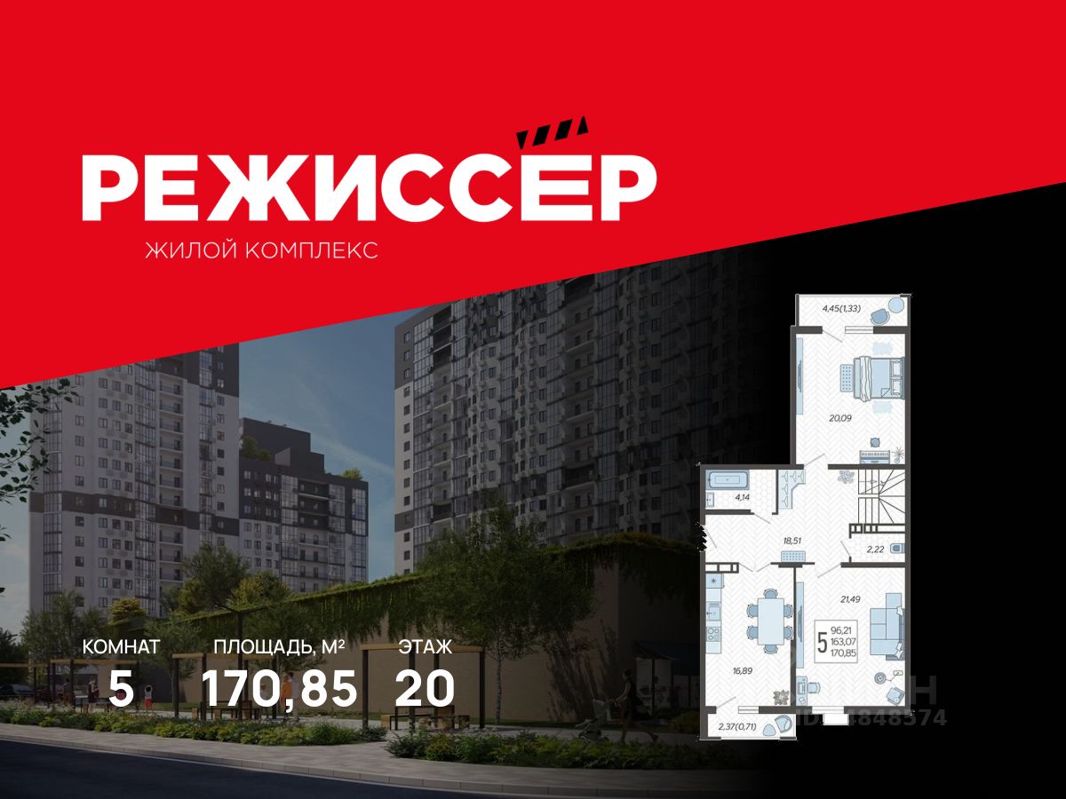 Продается 5-комнатная квартира в ЖК "Режиссёр" в доме (Литер 4), срок сдачи: 2 кв. 2026, общей площадью 170.85 кв.м., на 20 этаже. Без отделки, но с возможностью заказать ремонт.