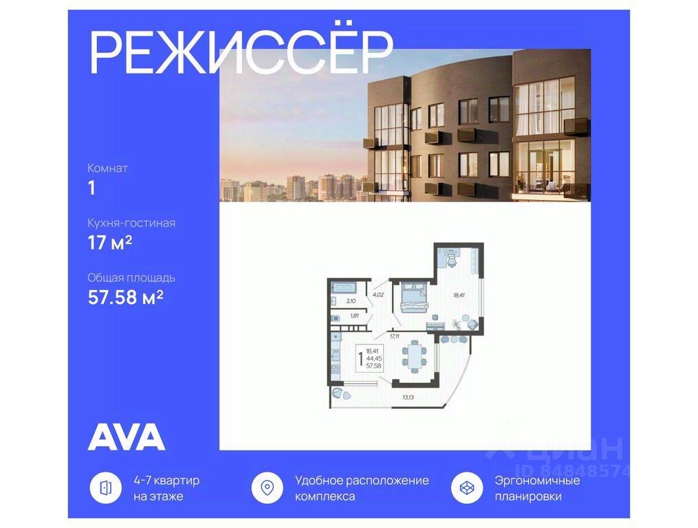 Продаются 1-комнатные апартаменты в ЖК "Режиссёр" в доме (Литер 4), срок сдачи: 2 кв. 2026, общей площадью 57.58 кв.м., на 12 этаже. Без отделки, но с возможностью заказать ремонт.
