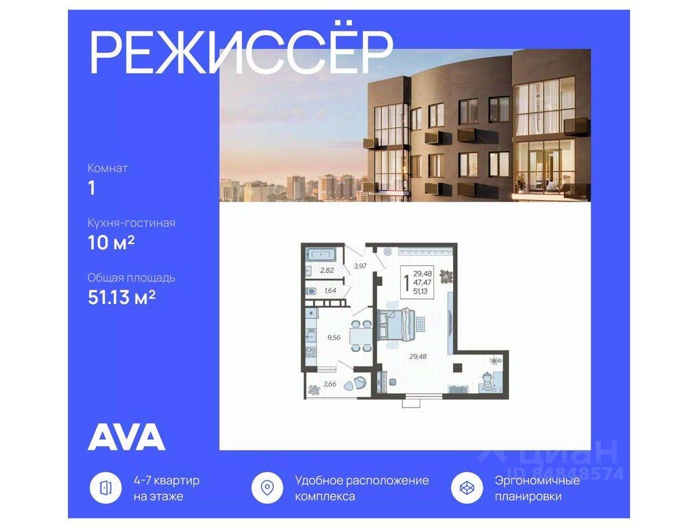 Продаются 1-комнатные апартаменты в ЖК "Режиссёр" в доме (Литер 4), срок сдачи: 2 кв. 2026, общей площадью 51.13 кв.м., на 13 этаже. Без отделки, но с возможностью заказать ремонт.