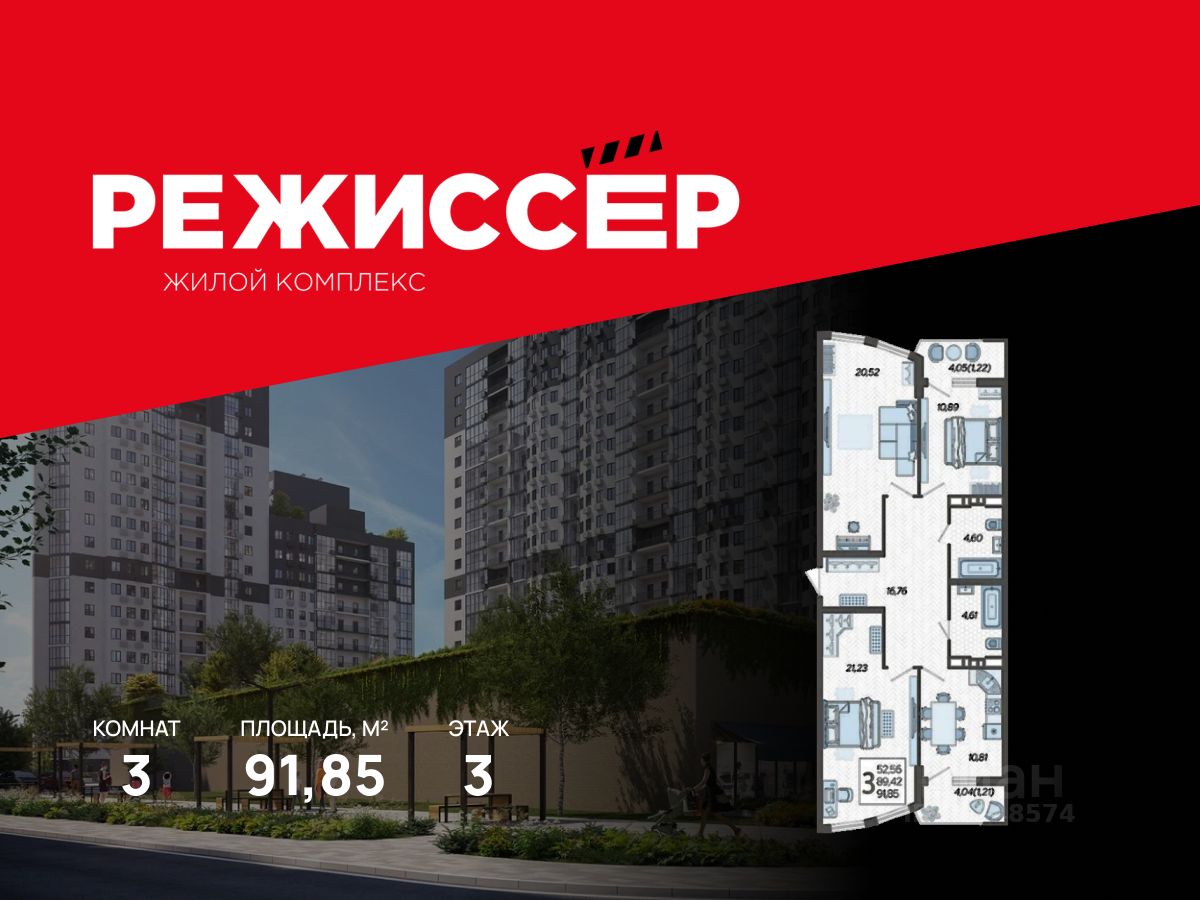 Продается 3-комнатная квартира в ЖК "Режиссёр" в доме (Литер 3), срок сдачи: 2 кв. 2026, общей площадью 91.85 кв.м., на 3 этаже. Без отделки, но с возможностью заказать ремонт.