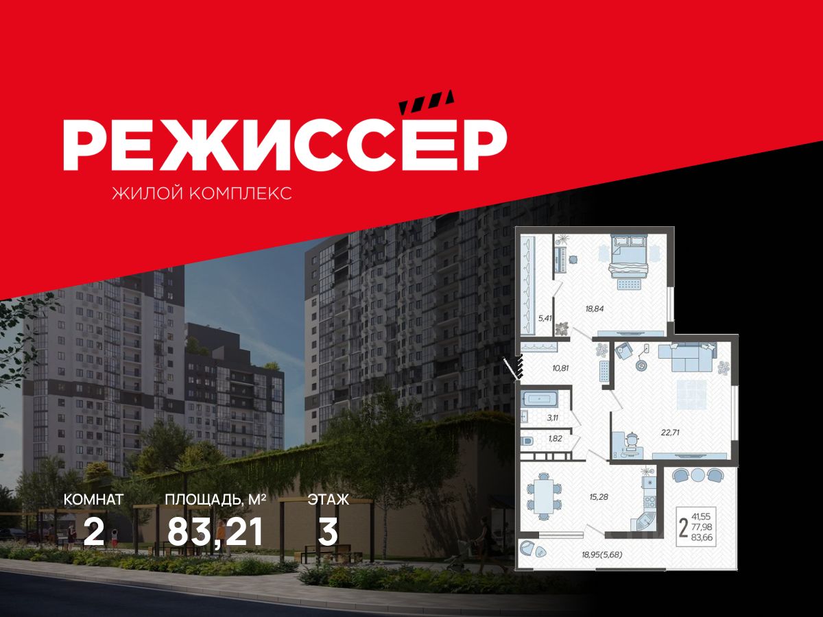 Продается 2-комнатная квартира в ЖК "Режиссёр" в доме (Литер 3), срок сдачи: 2 кв. 2026, общей площадью 83.21 кв.м., на 3 этаже. Без отделки, но с возможностью заказать ремонт.