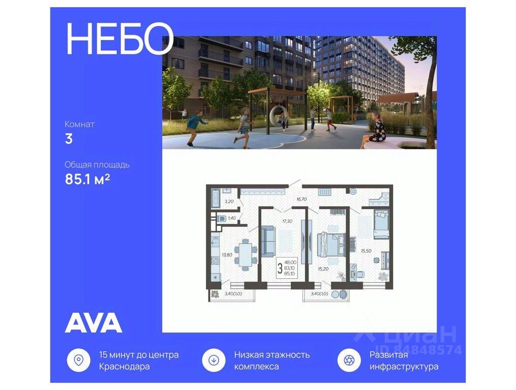 Жилой комплекс полностью сдан! В спокойном тихом районе Краснодара, утопающем в зелени, продается 3-комнатная квартира площадью 85.1 кв. м. Квартира расположена на 1 этаже, в жилом комплексе комфорт-класса "Небо". Девелопер проекта - компания AVA. "Небо" - идеальное место для жизни между небом и землей. Рядом парк, развитая инфраструктура, школы, детские сады, медицинские учреждения. Этот жилой комплекс - мечта для людей со спокойным ритмом жизни, ценящих уют и тишину почти в центре южной столицы. Транспортная доступность и окружение • 7 остановок общественного транспорта в шаговой доступности; • ПКиО имени 300-летия полиции России в 5 минутах пешком; • Парк "Патриот" с фонтаном в 10 минутах пешком; • Рядом улица Дзержинского - одна из основных магистралей Краснодара; • Удобный и быстрый выезд в центр города. Особенности архитектуры Жилой комплекс "Небо" - это 8 уютных 12-этажных домов с монолитным фундаментом. Фасад выдержан в бежевых и светло-коричневых тонах, легкости архитектуре придают лоджии с панорамным остеклением и "французские" окна. Достаточно большое расстояние между домами обеспечивает удобство перемещения во дворе и красивые виды из окон каждой квартиры. "Небо" - идеальный баланс комфорта и функциональности. Благоустройство территории Живописные дворы жилого комплекса "Небо" утопают в зелени - это идеальное место, где родители могут отдохнуть в тишине, пока их дети резвятся на ярких качелях и горках. Для маленьких жителей, подростков и спортсменов здесь расположены уникальные игровые зоны: площадки с развивающими малыми формами для игр, уютные качели-гнезда, веревочные комплексы, уличные тренажеры и многое другое. Входные группы Яркие небесные акценты в оформлении входных групп подчеркивают общую стилистику жилого комплекса. В каждом подъезде предусмотрены колясочные, дизайнерские лифты и круглосуточное видеонаблюдение. Другие преимущества: • Закрытая территория • Своя коммерция на первых этажах; • 2 подземных паркинга на территории ЖК; • Наземный 9-этажный паркинг; • Торговый центр, супермаркет и ВУЗ в шаговой доступности.