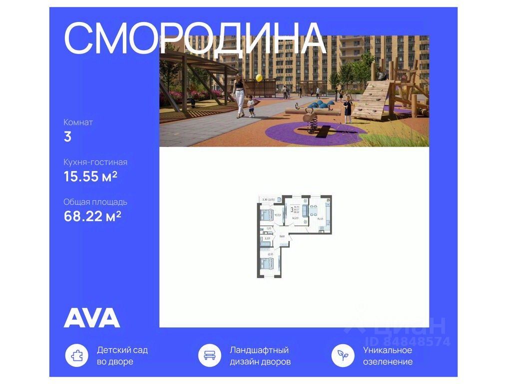 Продаётся 3-комнатная квартира 68 в ЖК "Смородина" (Корпус 19, Секция 2), на 5 этаже 12-этажного дома, срок сдачи: 2 кв. 2028, общей площадью 68,22 кв. м. Без отделки.