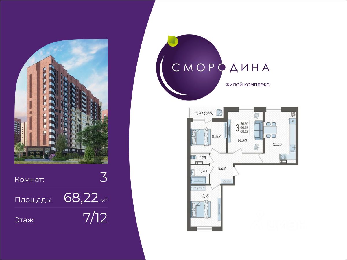 Продаётся 3-комнатная квартира 76 в ЖК "Смородина" (Корпус 19, Секция 2), на 7 этаже 12-этажного дома, срок сдачи: 2 кв. 2028, общей площадью 68,22 кв. м. Без отделки.
