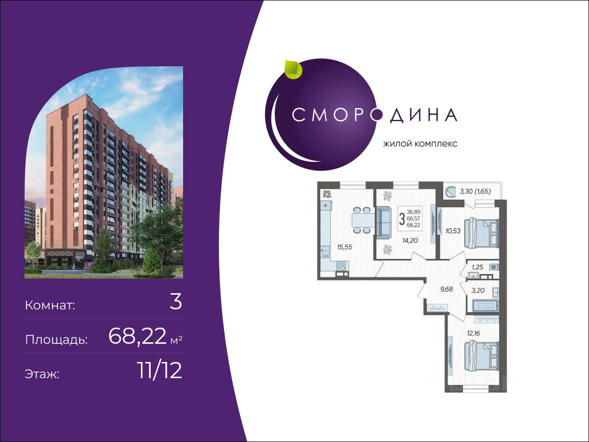 В продаже 3-комнатная квартира площадью 68.22 кв. м, расположенная 19 жилого комплекса комфорт-класса "Смородина". Комплекс от девелопера AVA находится на востоке Краснодара, в Новознаменском районе.
