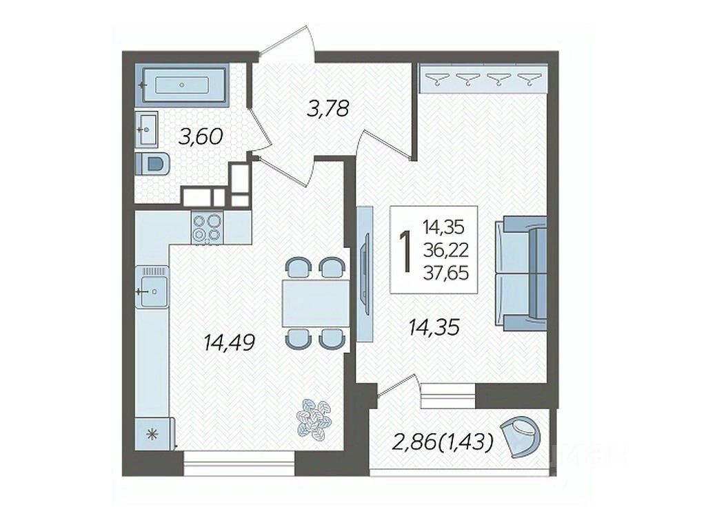 Продаётся 1-комнатная квартира 345 в ЖК "Смородина" (Корпус 14, Секция 2), на 16 этаже 19-этажного дома, срок сдачи: 4 кв. 2025, общей площадью 37,65 кв. м. Без отделки.