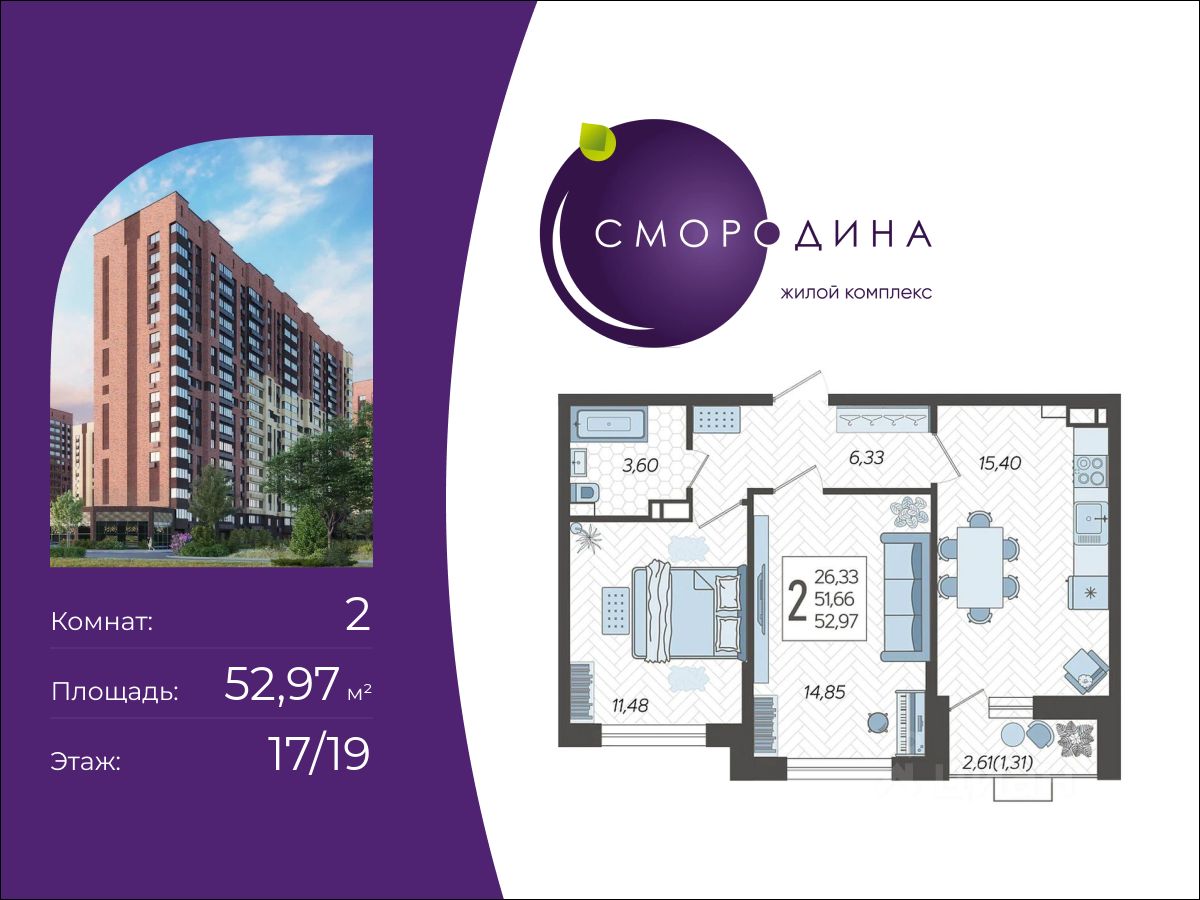 В продаже 2-комнатная квартира площадью 52.97 кв. м, расположенная 14 жилого комплекса комфорт-класса "Смородина". Комплекс от девелопера AVA находится на востоке Краснодара, в Новознаменском районе.