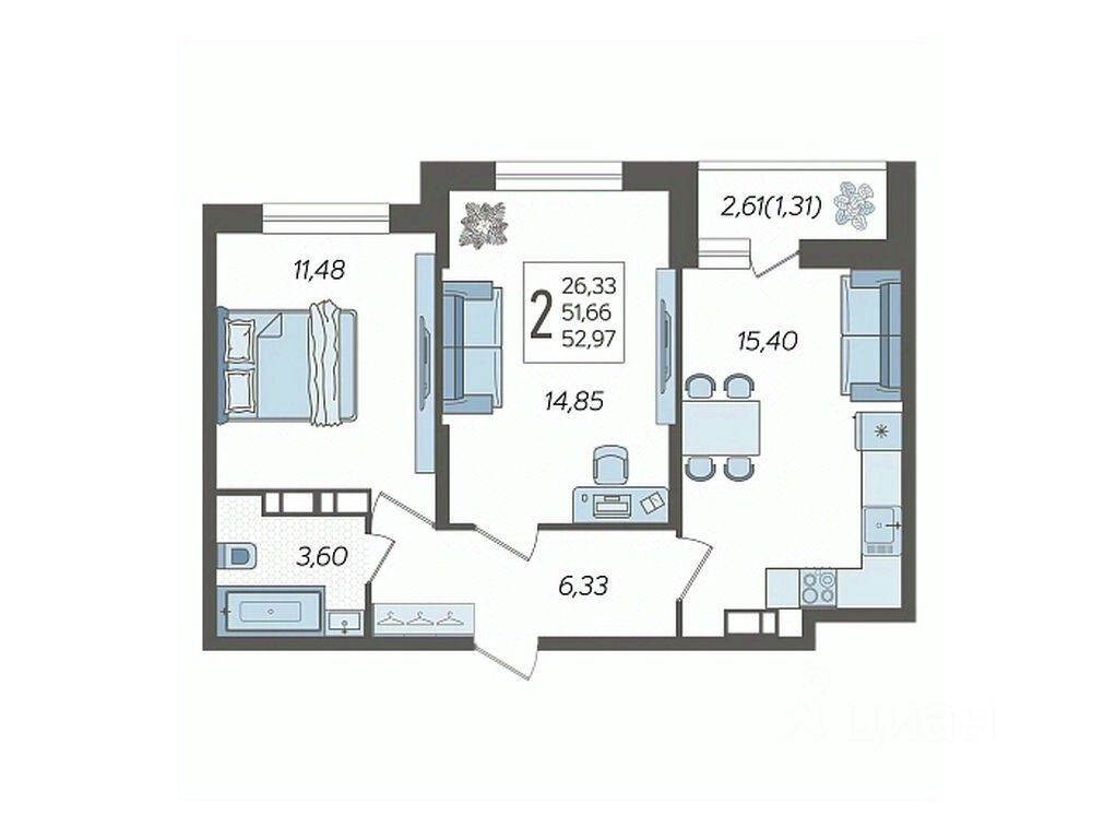 Продаётся 2-комнатная квартира 390 в ЖК "Смородина" (Корпус 14, Секция 3), на 1 этаже 19-этажного дома, срок сдачи: 4 кв. 2025, общей площадью 52,97 кв. м. Без отделки.