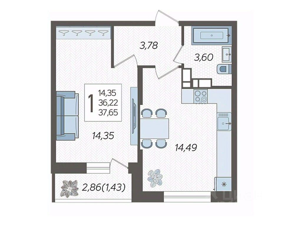 Продаётся 1-комнатная квартира 556 в ЖК "Смородина" (Корпус 14, Секция 3), на 18 этаже 19-этажного дома, срок сдачи: 4 кв. 2025, общей площадью 37,65 кв. м. Без отделки.