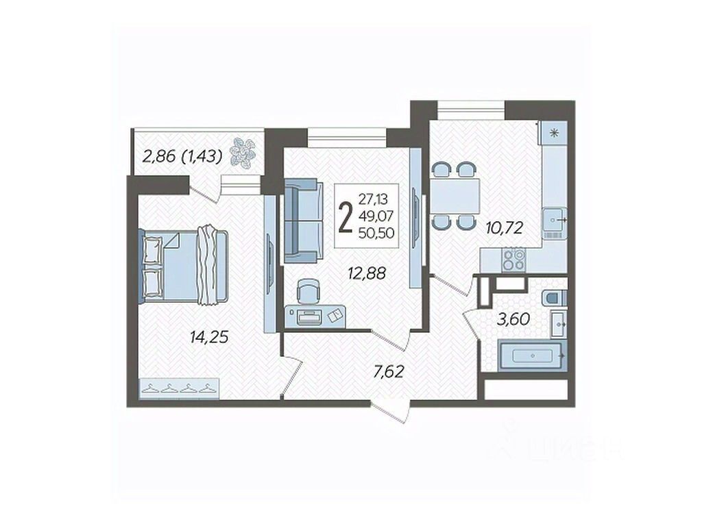 Продаётся 2-комнатная квартира 290 в ЖК "Смородина" (Корпус 12, Секция 2), на 15 этаже 16-этажного дома, срок сдачи: 4 кв. 2026, общей площадью 50,5 кв. м. Без отделки.