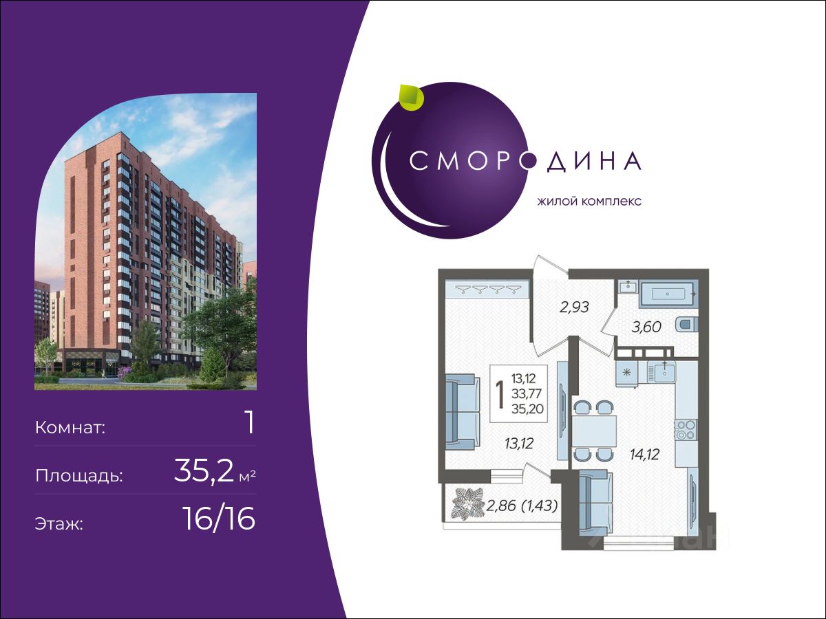 В продаже 1-комнатная квартира площадью 35.2 кв. м, расположенная 12 жилого комплекса комфорт-класса "Смородина". Комплекс от девелопера AVA находится на востоке Краснодара, в Новознаменском районе.