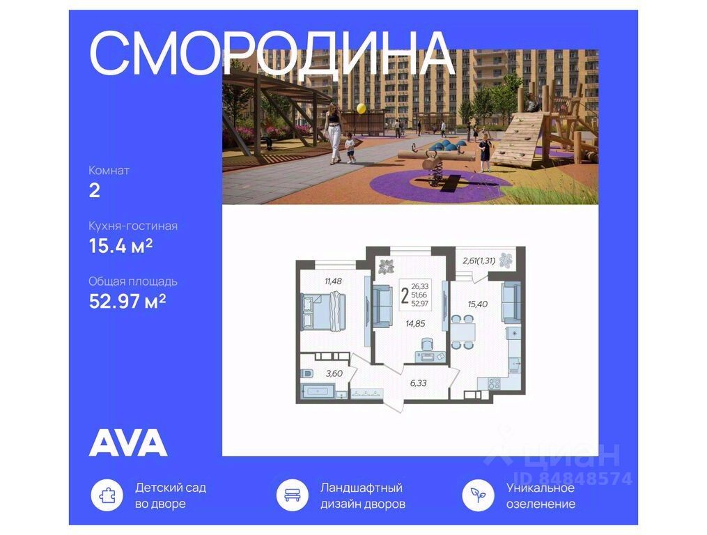 Продаётся 2-комнатная квартира 100 в ЖК "Смородина" (Корпус 18, Секция 1), на 10 этаже 12-этажного дома, срок сдачи: 2 кв. 2028, общей площадью 52,97 кв. м. Без отделки.