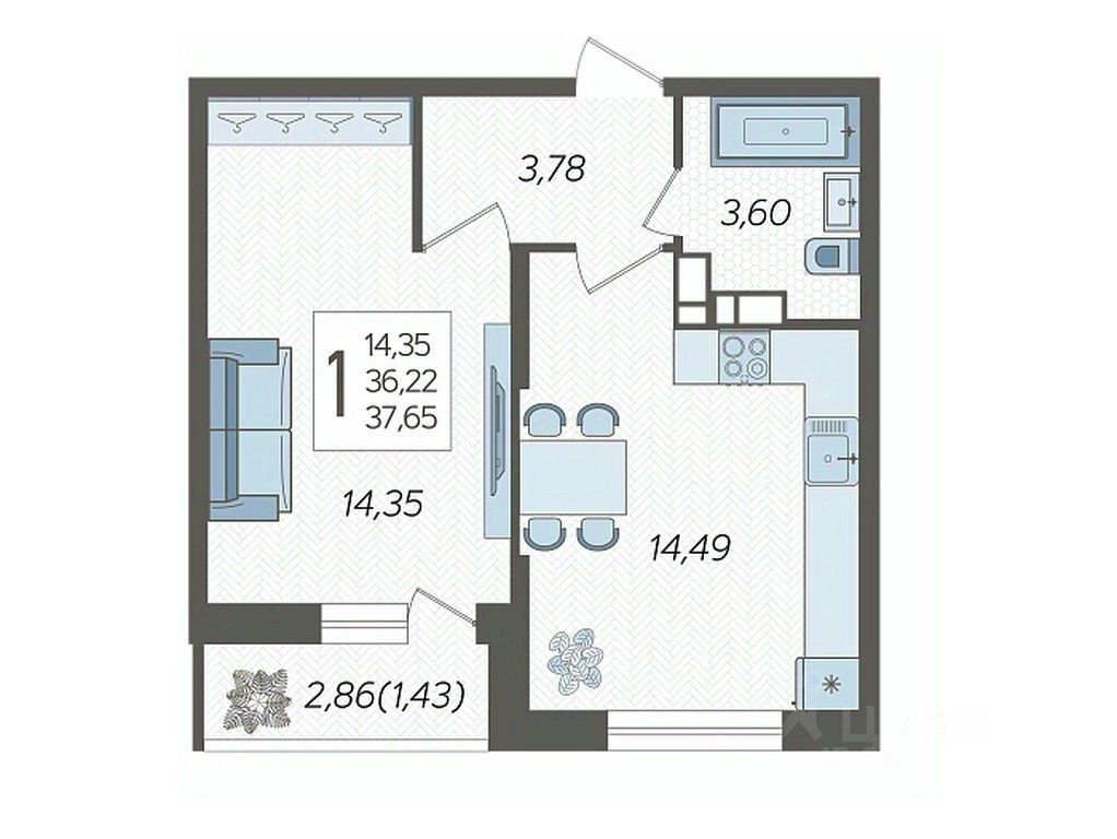 Продаётся 1-комнатная квартира 306 в ЖК "Смородина" (Корпус 18, Секция 3), на 7 этаже 12-этажного дома, срок сдачи: 2 кв. 2028, общей площадью 37,65 кв. м. Без отделки.