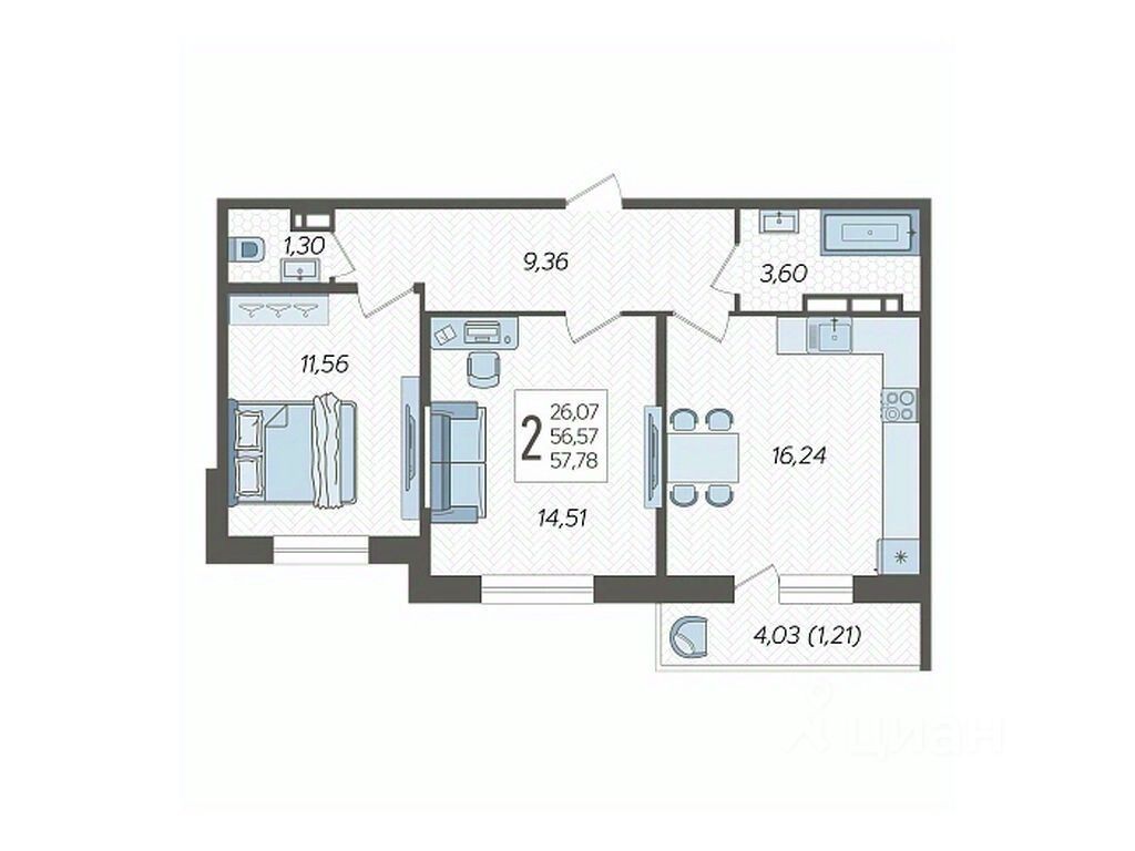 Продаётся 2-комнатная квартира 23 в ЖК "Смородина" (Корпус 17, Секция 1), на 6 этаже 12-этажного дома, срок сдачи: 2 кв. 2028, общей площадью 57,78 кв. м. Без отделки.