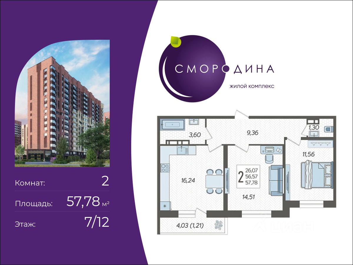В продаже 2-комнатная квартира площадью 57.78 кв. м, расположенная 17 жилого комплекса комфорт-класса "Смородина". Комплекс от девелопера AVA находится на востоке Краснодара, в Новознаменском районе.