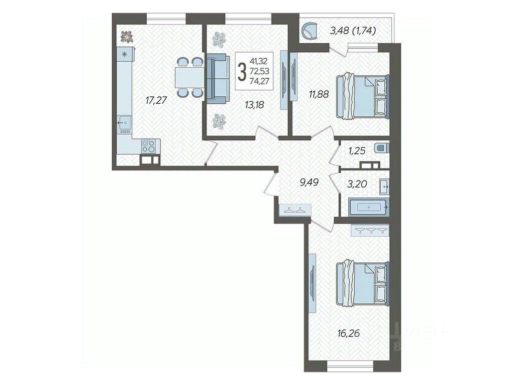 Продаётся 3-комнатная квартира 17 в ЖК "Смородина" (Корпус 13, Секция 1), на 5 этаже 19-этажного дома, срок сдачи: 4 кв. 2026, общей площадью 74,27 кв. м. Без отделки.