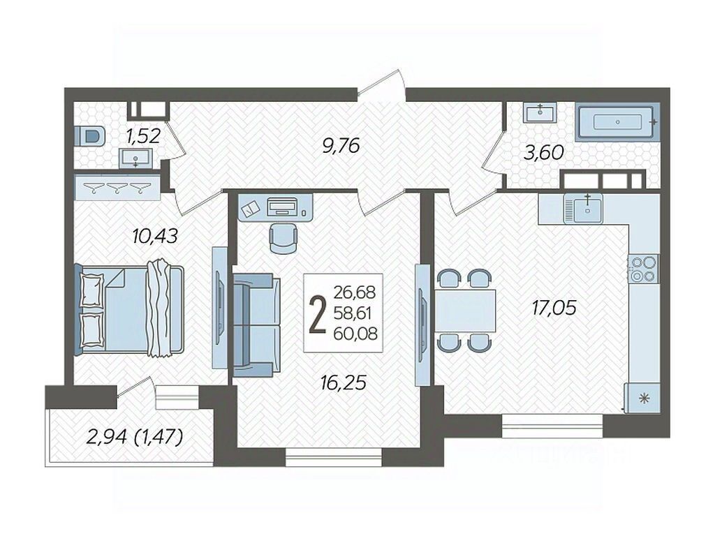 Продаётся 2-комнатная квартира 55 в ЖК "Смородина" (Корпус 13, Секция 1), на 14 этаже 19-этажного дома, срок сдачи: 4 кв. 2026, общей площадью 60,08 кв. м. Без отделки.