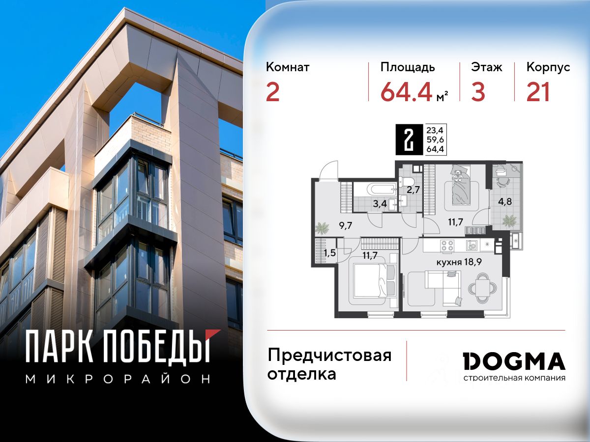 Срок сдачи: 4 кв. 2025, общей площадью 64.4 кв.м., на 3 этаже.