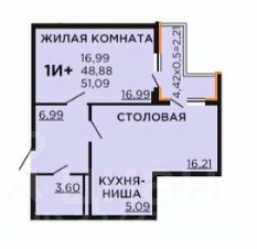 Однокомнатная (Евро-2) квартира 49,1 кв.м, Краеведа Соловьёва, 6/1, ЖК "Краски", 8/8 эт., монолит-кирпич, Прикубанский район