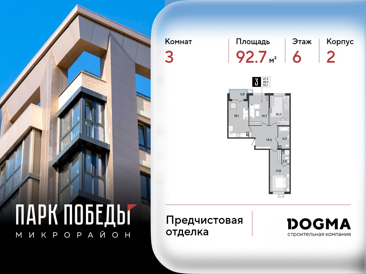 Срок сдачи: 2 кв. 2026, общей площадью 92.7 кв.м., на 6 этаже.