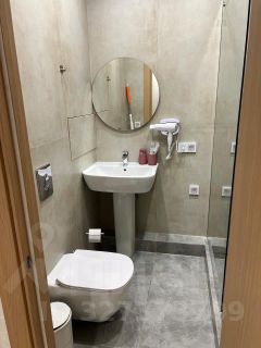 Совмещенный санузел выполнен в светлых тонах с качественной сантехникой и душевой кабиной. Встроенные шкафы обеспечивают достаточно места для хранения вещей.